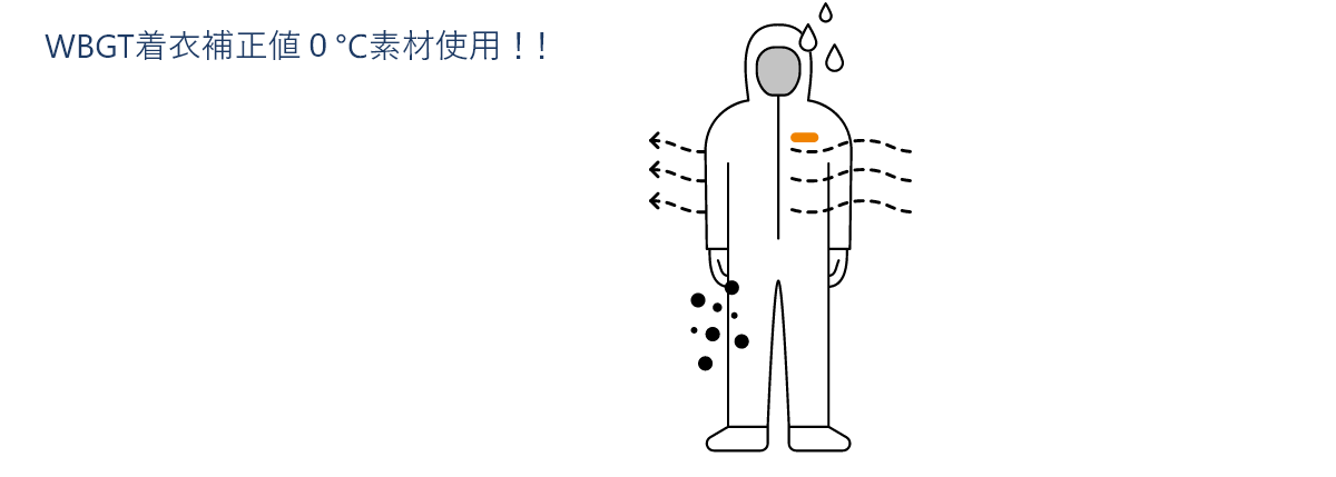 WBGT値(暑さ指数)は、気温、湿度、風速、輻射熱(放射熱)、身体作業強度、作業服の熱特性を考慮した熱中症の発生リスクの有無をスクリーニングする指標です。着用する防護服によっては、作業現場で計測したWBGT値に、以下の着衣補正値を加える必要があり、防護服の素材選びも非常に重要になっています。